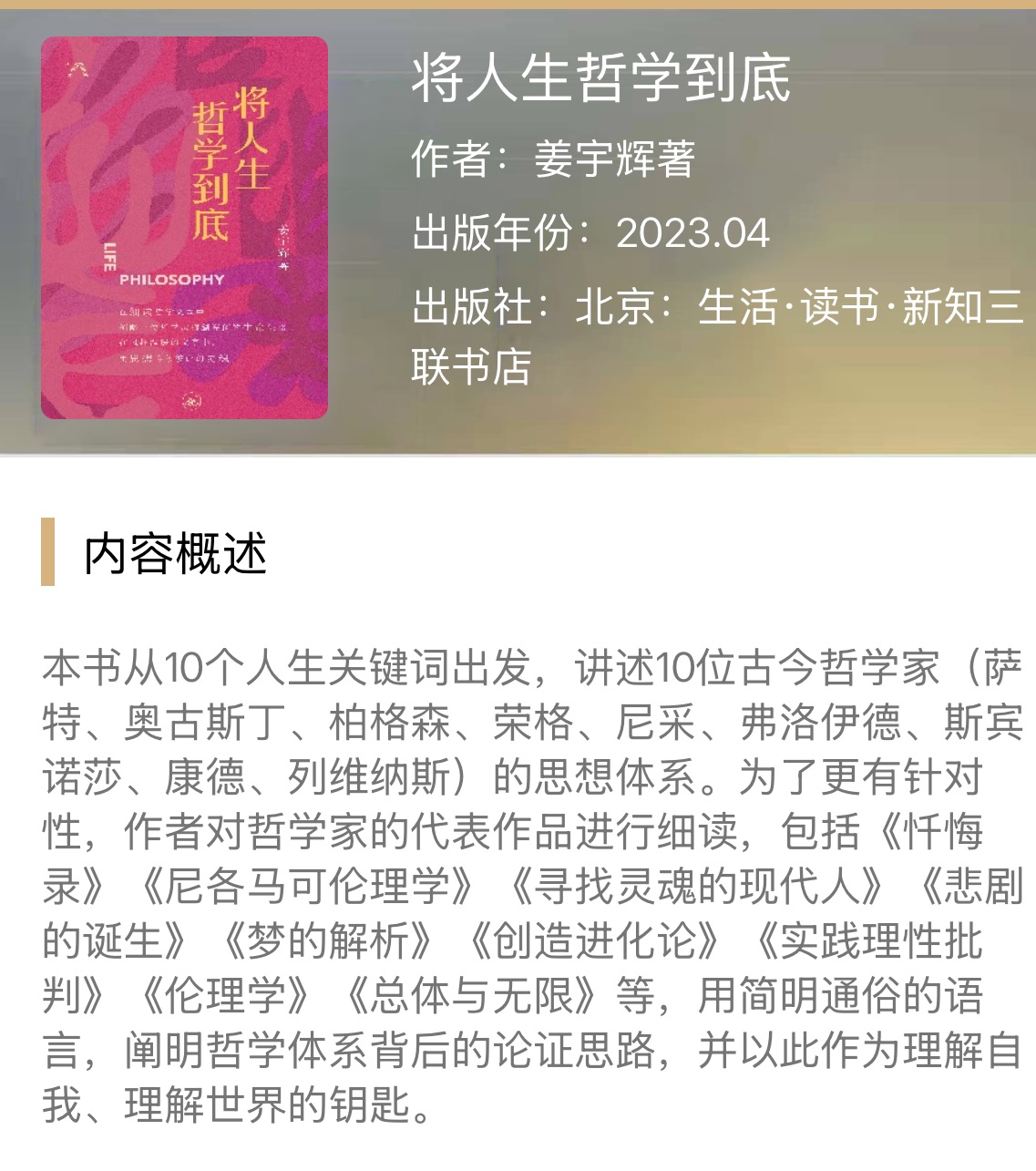 本书从10个人生关键词出发,讲述10位古今哲学家(萨特、奥古斯丁、柏格森、荣格、尼采、弗洛伊德、斯宾诺莎、康德、列维纳斯)的思想体系。为了更有针对性,作者对哲学家的代表作品进行细读,包括《忏悔 录》《尼各马可伦理学》 《寻找 灵魂的现代人》《悲剧 的诞生》《梦的解析》 《创造进化论》 《实践理 性批 判》《伦理学》 《总体与无限》等,用简明通俗的语言,阐明哲学体系背后的论证思路,并以此作为理解自我、理解世界的钥匙。