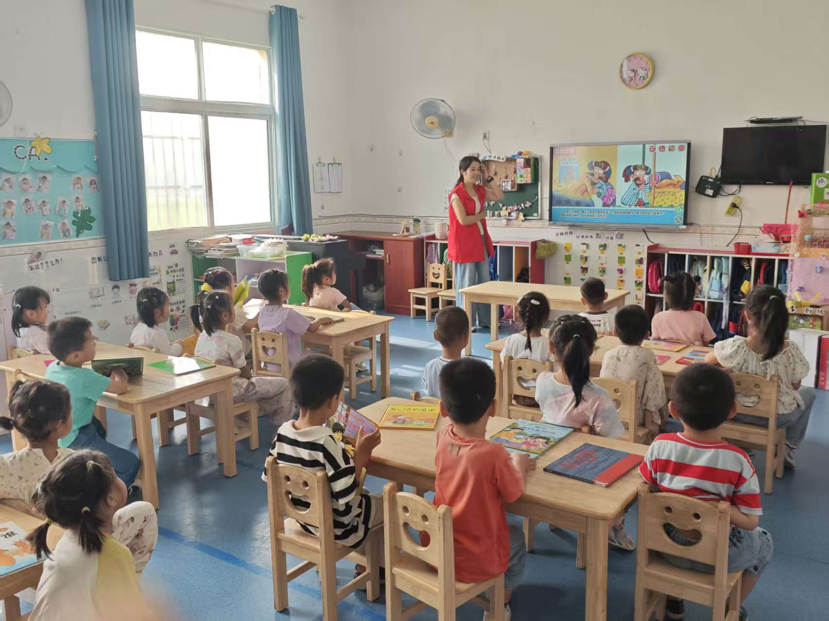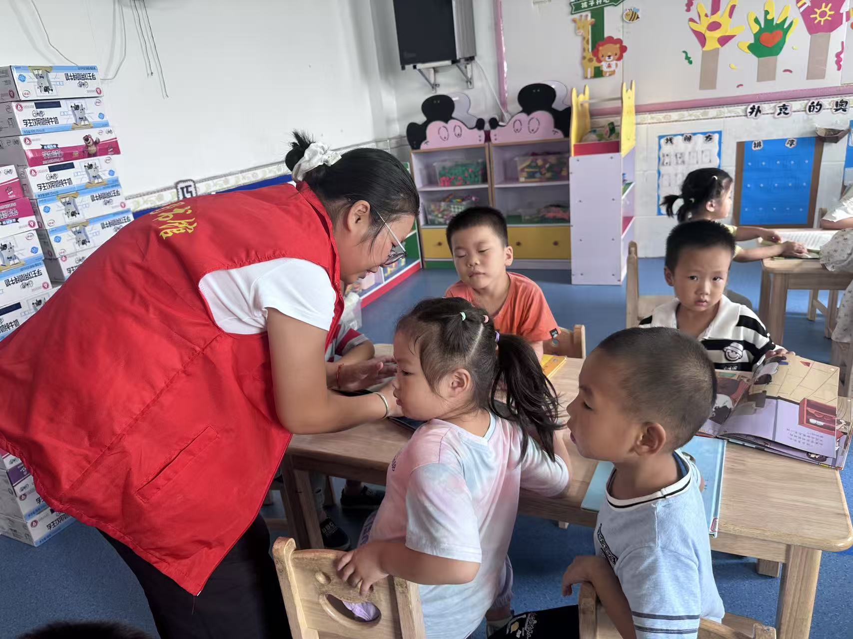 活动现场,图书馆工作人员与幼儿园师生默契分工:一人递绘本、一人理书堆,将崭新绘本逐本摆放整齐后,微笑着送到每个孩子手中。图书馆志愿者现场解读绘本《点石成金》,边展示色彩鲜亮的图画,边用夸张的语气模仿角色对话,讲到精彩处还伸手与孩子互动。孩子们有的托着腮、有的凑向前,眼睛紧紧盯着绘本,不时发出阵阵笑声,这份带着温度的爱心举动,让现场留守儿童的小脸上都洋溢着幸福,切实感受到了来自外界的温暖与关怀。